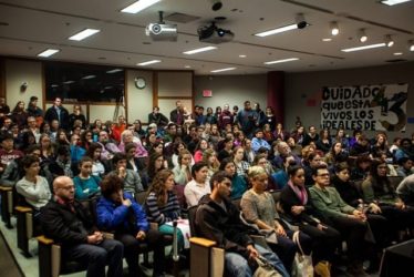 The three asked for the support of those present in demanding the Mexican and U.S. governments hold those responsible accountable for the crime. As they spoke, a petition demanding the halt of U.S. military aid to Mexico was circulated around the auditorium, along with photos of the 43 Mexican students.