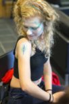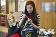 As part of the Hurford Center’s weekly CROSSLISTED series, Monique Bryars ’19 held a makeup demonstration in the Cantor Fitzgerald Art Gallery Lounge on Friday, October 30, just in time for Halloween weekend. Madeline Perry ’18 volunteered to be the model, and Bryars made her up to be a sinister mermaid. First, Bryars slathered latex modeling wax on Perry’s arm and face, and then sculpted and airbrushed it to look like bleeding gashes. She also demonstrated how to attach a prosthetic to skin. (In this case, the prosthetic was a seashell she made out of cardboard and paint that she affixed to Perry’s back). The result was a beautifully morbid depiction of a creepy Halloween mermaid.