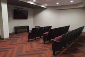 Although the old theater had to make way for new times, its legacy also lives on in the basement’s brand new movie theater. The room, right near the entrance from the Oval, boasts a flat screen TV and several of the old theater’s folding chairs, which feature distinctly discontinuous marking numbers as a reminder of what used to be.