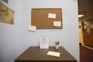 The walls of the rectangular gallery are adorned with an even mix of AFSC banners, which are more modern, glossy presentations of the organizational history, and glass cases filled with much older-looking, typewriter-produced letters, telegraphs, and print material. “It’s interesting aesthetically,” commented McGlynn.