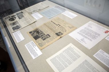 The AFSC, as part of its centennial celebration, has been staging a traveling exhibition featuring printed banners that detail their current and former work. The exhibition and its banners are now making a stop at Haverford, colliding with the College’s extensive historical material available in Quaker & Special Collections, which sits right next door to the gallery. McGlynn’s primary job as curator was to make sense of all of this material, which includes personal letters, meeting minutes, and photographs, and put it in conversation with the AFSC exhibition materials.
