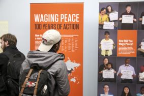 Last week Magill Library’s Sharpless Gallery, for its second consecutive exhibit, unveiled a student-curated show. Sophie McGlynn ’18, a political science major and peace, justice, and human rights concentrator, welcomed students, faculty, and staff into the gallery to enjoy her Waging Peace: 100 Years of Quakers, Moral Quandaries, and a Quest for Justice—an exhibit of the American Friends Service Committee, which delves into the work of the Quaker pacifist organization and celebrates a century of its existence.