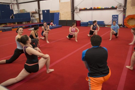 When: The club members drive off-campus to Upper Merion Dance and Gymnastics Center in King of Prussia every Monday and Thursday evening to work out with a coach for an hour and a half. A typical meeting starts off with a warm-up, stretching, and basic floor-skill drills led by either the coach or one of the co-heads. At the end of every workout, everyone reconvenes for conditioning.