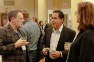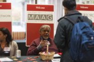 Maurice Rippel ’19 speaking with Jim Pabarue ’72, co-chair of the Multicultural Alumni Action Group (MAAG) during the Alumni and Parent Relations Office’s Connections Fair held in the Dining Center’s Sunken Lounge. Photo by Patrick Montero