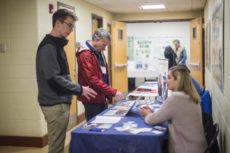 Students and their families meet with representatives of partner institutions abroad and college departments at the Study Abroad Fair in Stokes Lobby during the 2018 Family and Friends Weekend. Photo by Patrick Montero