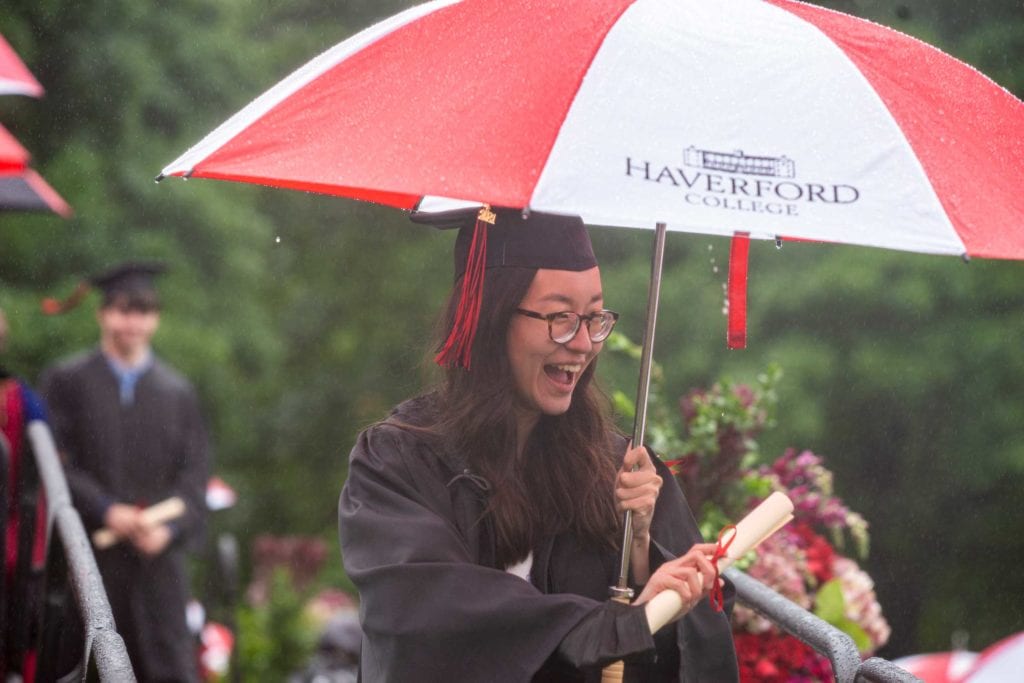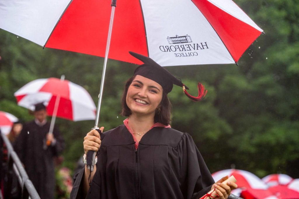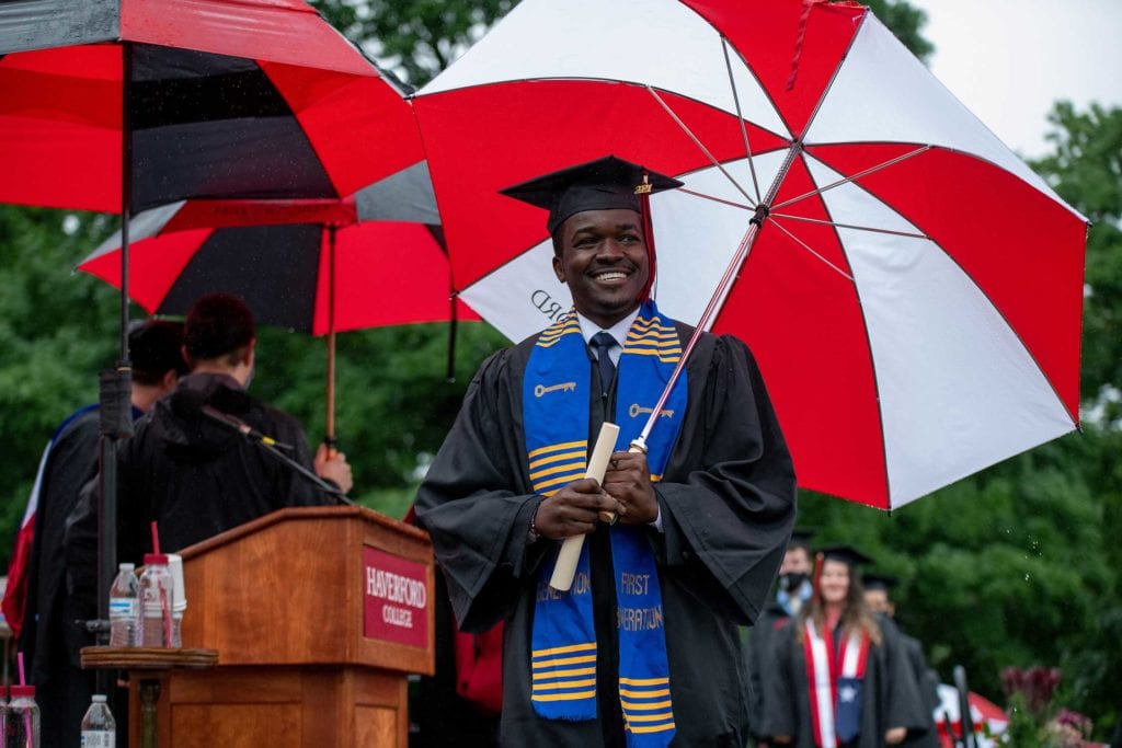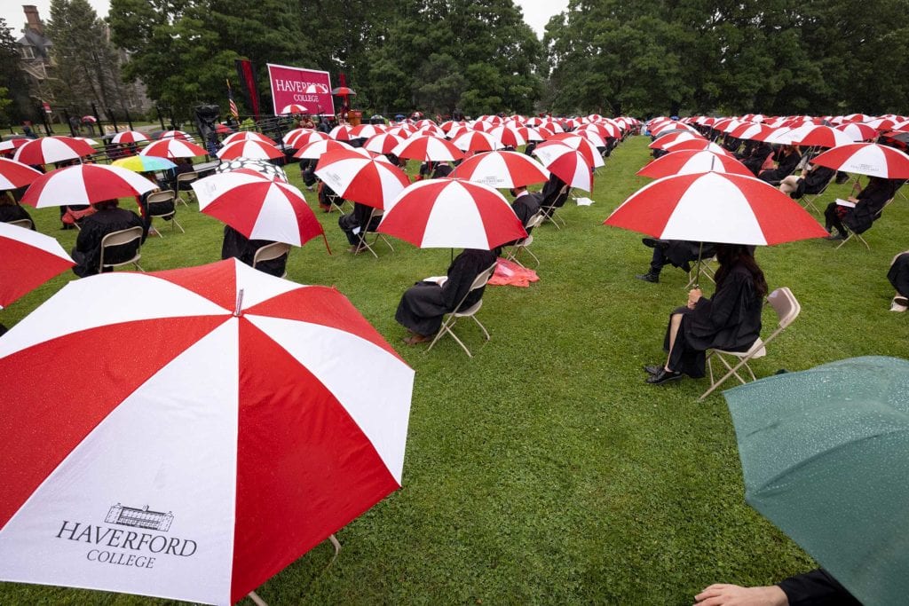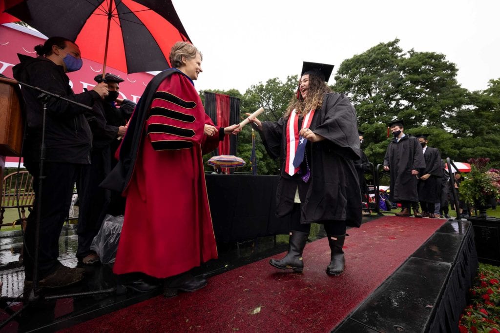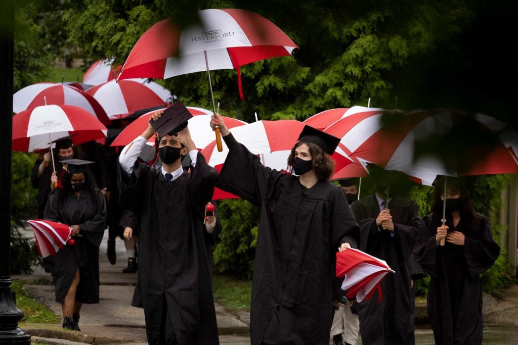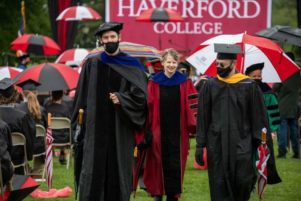 But even rain couldn’t dampen the good spirits of the resilient Class of 2021, who finished their college careers during a global pandemic. The graduates carried cheerful red-and-white-striped Haverford umbrellas as they processed onto Cope Field and walked across the stage to get their diplomas from President Wendy Raymond.