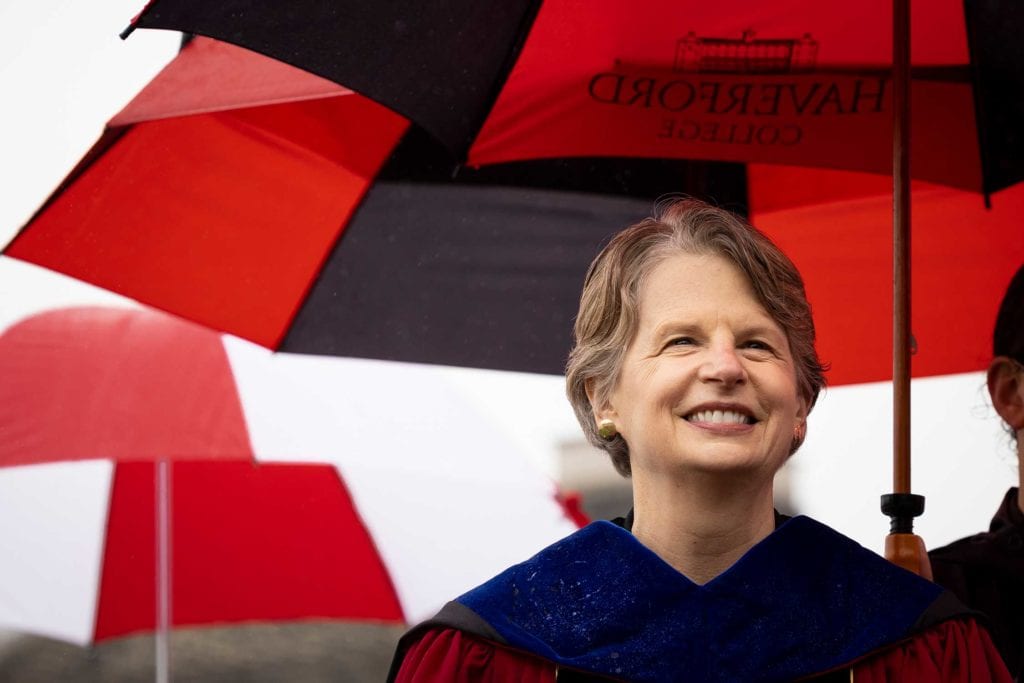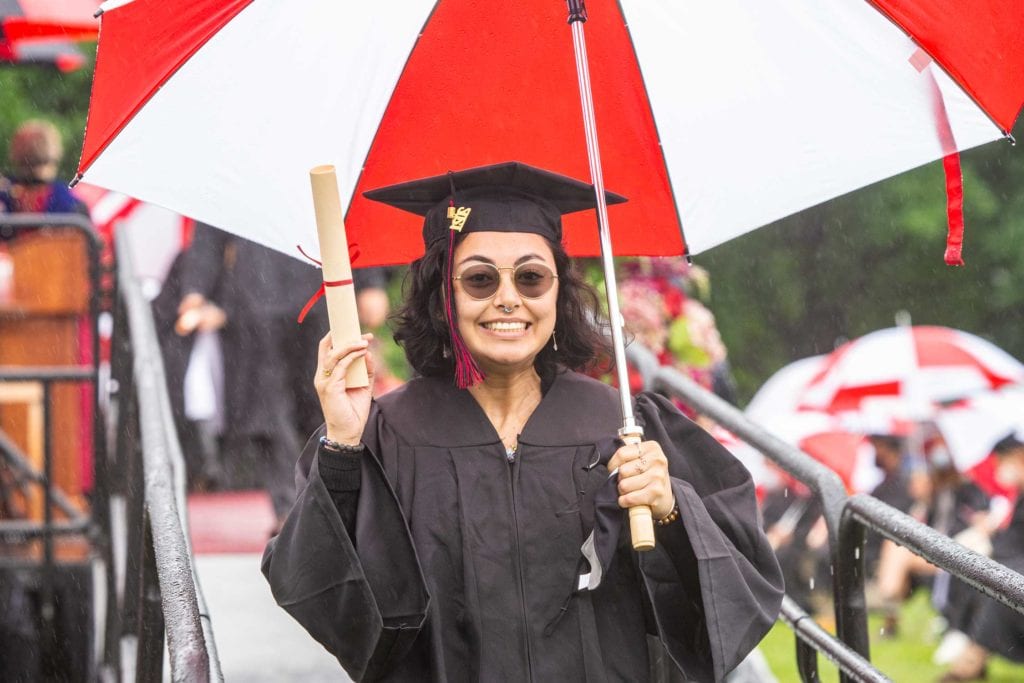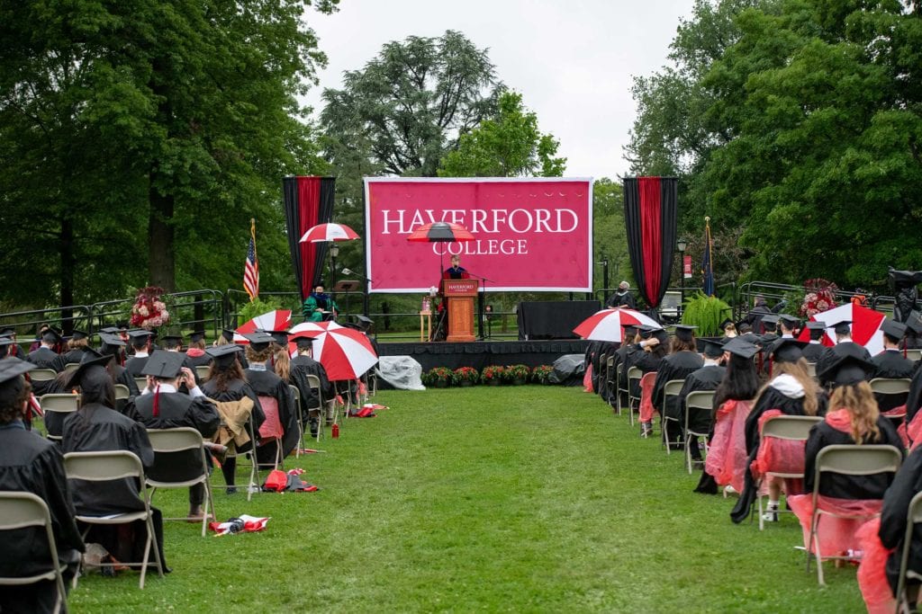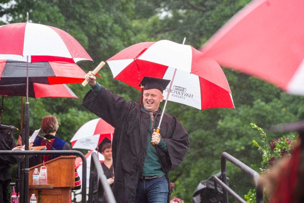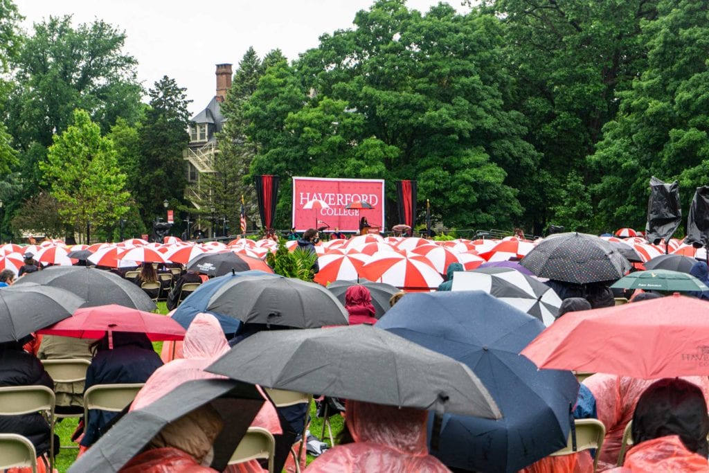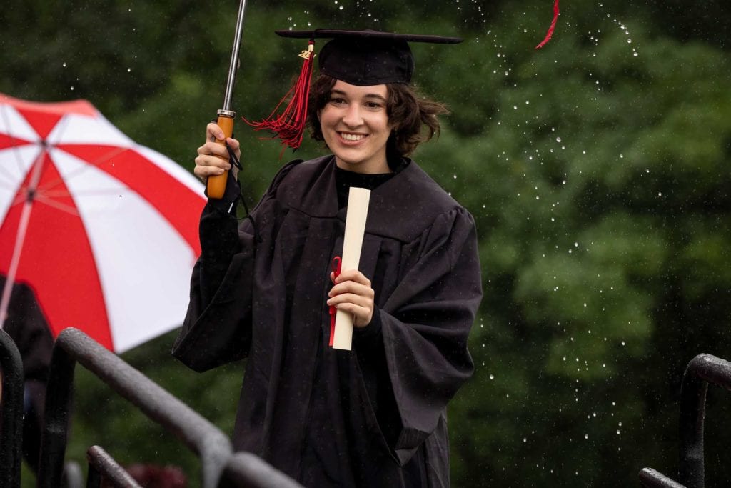 But even rain couldn’t dampen the good spirits of the resilient Class of 2021, who finished their college careers during a global pandemic. The graduates carried cheerful red-and-white-striped Haverford umbrellas as they processed onto Cope Field and walked across the stage to get their diplomas from President Wendy Raymond.