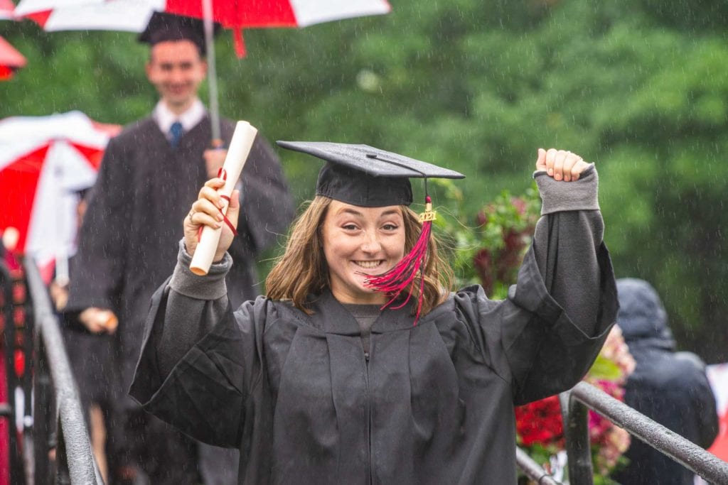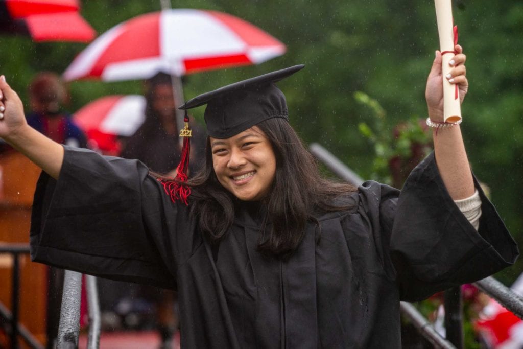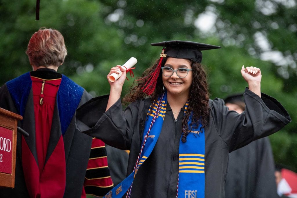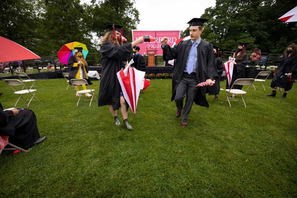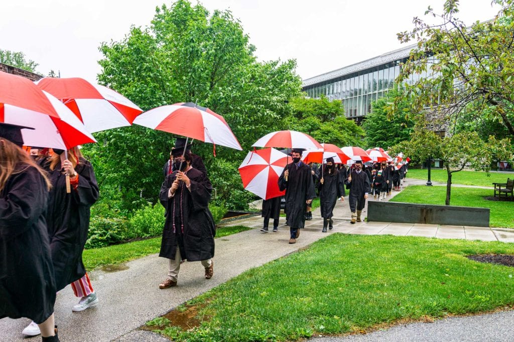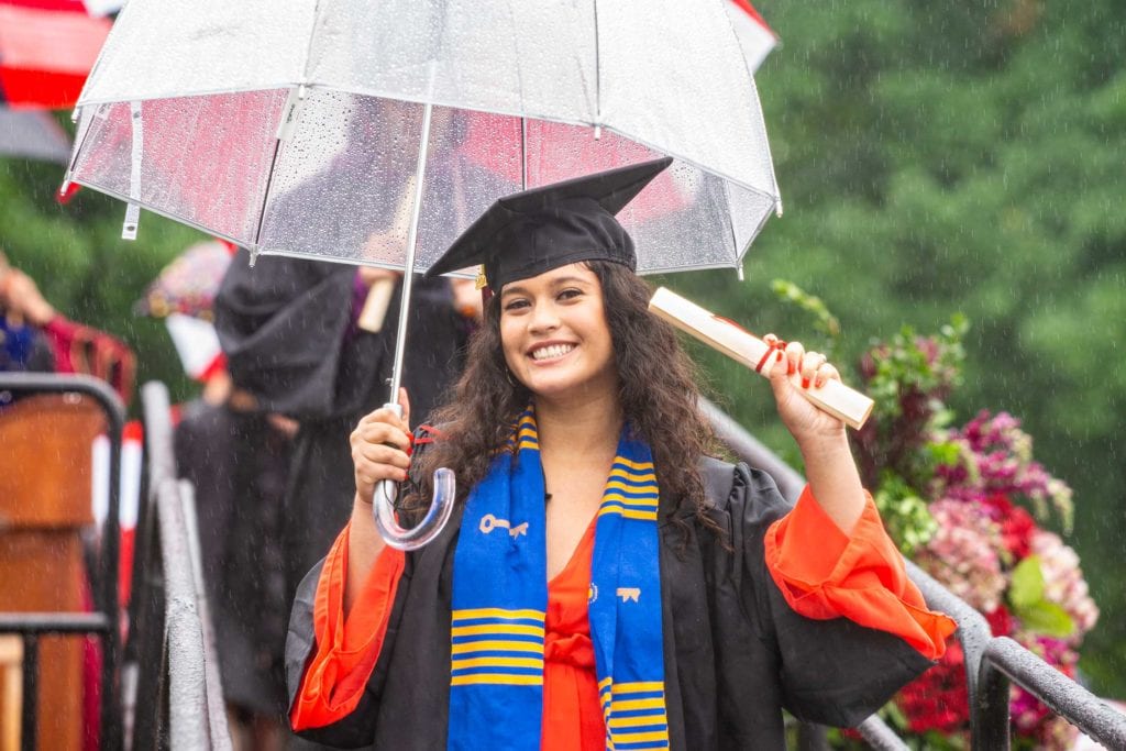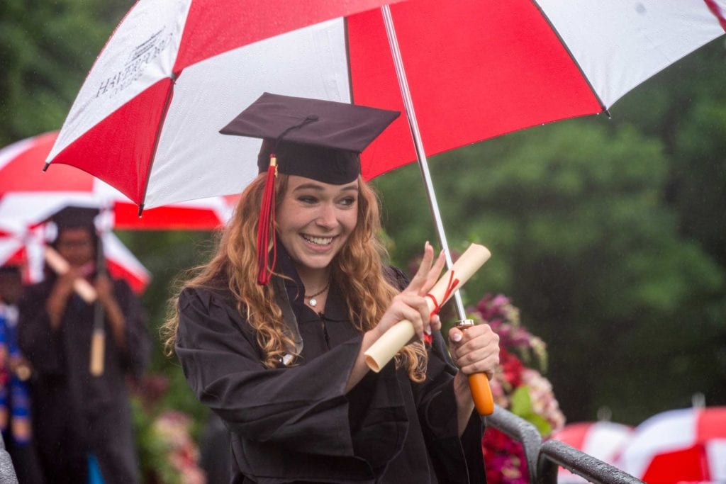 But even rain couldn’t dampen the good spirits of the resilient Class of 2021, who finished their college careers during a global pandemic. The graduates carried cheerful red-and-white-striped Haverford umbrellas as they processed onto Cope Field and walked across the stage to get their diplomas from President Wendy Raymond.