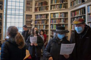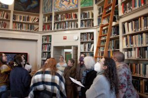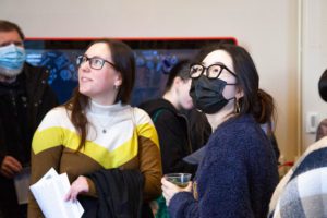 Peter Deng ’23, who took inspiration from moon motifs in Charles Baudelaire’s poetry and Greek mythology for his two paintings says the process of integrating astronomy and art was a great way to discover the interdisciplinary nature of art. At the opening event, visitors enjoyed the new installation. Mellon Postdoctoral Fellow and Visiting Assistant Professor of Anthropology Jia Hui Lee commented that this student work expands his traditional thinking about astronomy by presenting the content “not through telescopes, but through myths, stories, and art being able to locate those.”