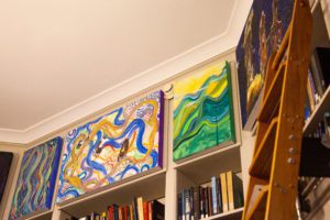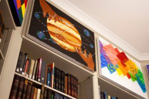 The project started last summer when head librarian Terry Snyder and science library Carol Howe were brainstorming ways to improve the Astronomy Library. They decided to leave the top two shelves of the library shelves unused since they were too high to be practical, and Howe thought about putting art in that space. The librarians then asked Professor Li if she would be interested in having her students create mural style art for the space. Despite already having a curriculum set for the fall semester, she was excited to take on this new challenge.